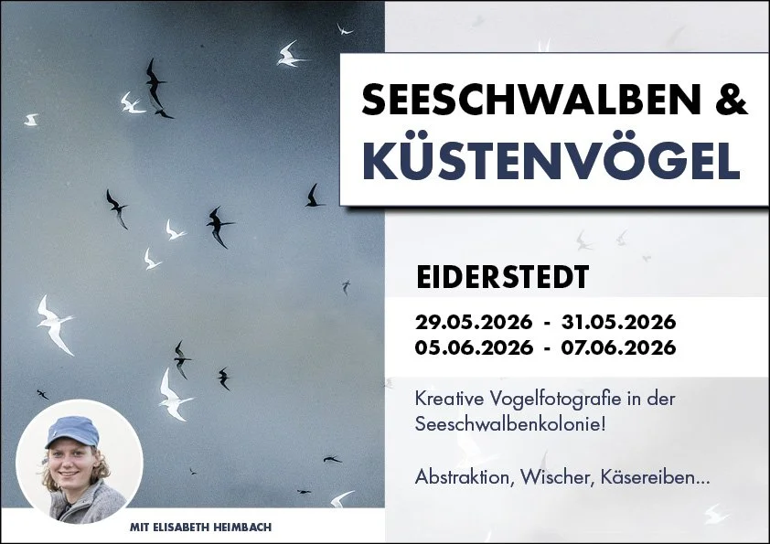 Die Luft schwirrt im Flügelschlag der Seevogelkolonie. Eine Lachmöwe jagt eine andere, die Seeschwalben präsentieren stolz ihre neuste Beute. Ein Vogel kommt zu nah an das Nest des Nachbarn, es wird um jeden Fisch gestritten. Doch was fotografieren wir hier zuerst? Worauf richtet sich unser Fokus inmitten tausender Motive? Wie fotografieren wir, was wir wahrnehmen und empfinden? Im Eldorado der Motive probieren wir uns aus!